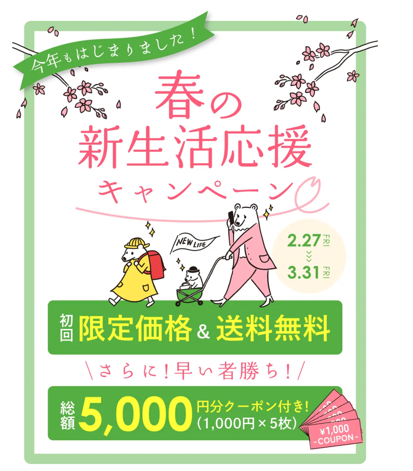 - 早い者勝ち 総額5,000円分クーポン付き