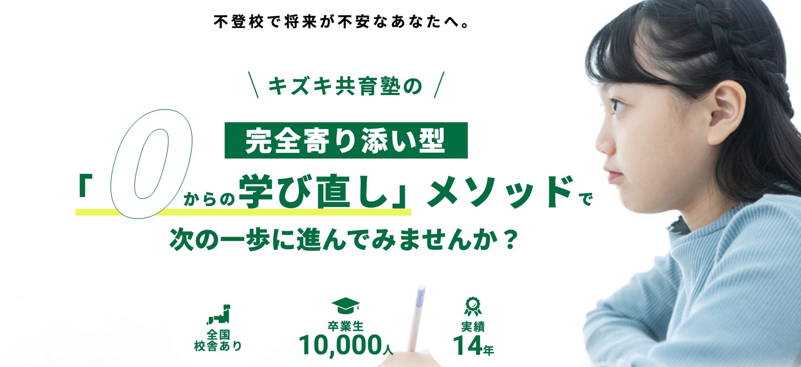 キズキ共育塾は、不登校や学習ブランクがある人のための完全個別指導塾です。